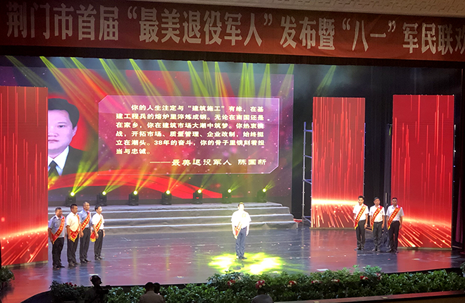 7月29日,“八一”建軍節(jié)前夕,荊門(mén)市首屆“最美退役軍人”發(fā)布儀式暨慶“八一”軍民聯(lián)歡演出在荊門(mén)劇院隆重舉行。此次全市“最美退役軍人”評(píng)選,經(jīng)網(wǎng)絡(luò)投票、意見(jiàn)征求和綜合審核等環(huán)節(jié)層層篩選,最終湖北荊門(mén)建工集團(tuán)有限公司陳國(guó)新等來(lái)自全市各自崗位的20名優(yōu)秀退役軍人脫穎而出榮獲“最美退役軍人”稱(chēng)號(hào)。