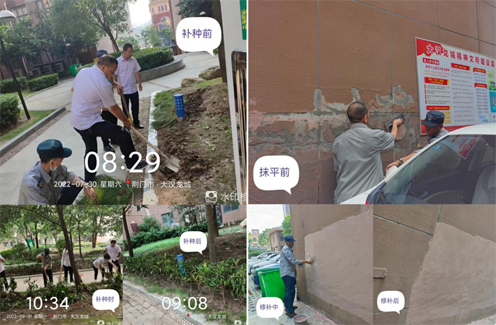 為進(jìn)一步提升小區(qū)的環(huán)境建設(shè),營(yíng)造一個(gè)宜居、溫馨、和諧的小區(qū)氛圍。炎炎烈日下,服務(wù)中心工作人員不畏酷暑,揮汗如雨,對(duì)園區(qū)部分綠化帶進(jìn)行補(bǔ)種、澆水,細(xì)心地為園區(qū)的綠化做了一次“美容”。此外,工作人員還對(duì)小區(qū)樓棟脫落的外墻進(jìn)行補(bǔ)平、修復(fù),為原本裸露的墻體重新“穿上”了新衣。