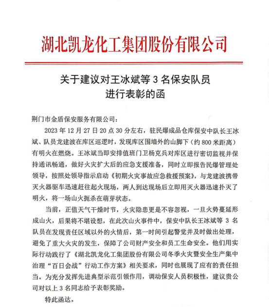 近日,市金盾保安公司安保守護(hù)分公司駐湖北凱龍化工集團(tuán)保安分隊(duì)在執(zhí)行夜間庫房巡邏勤務(wù)時(shí)及時(shí)撲滅初起火災(zāi),有效避免了安全事故發(fā)生,受到客戶單位來函表揚(yáng),救火事跡也被凱龍集團(tuán)在內(nèi)部進(jìn)行了宣傳。當(dāng)日晚8時(shí)30分左右,該分隊(duì)隊(duì)員在開展夜間庫房巡邏時(shí),發(fā)現(xiàn)庫區(qū)圍墻外有明火在燃燒,隊(duì)員立即暫停巡邏,在嚴(yán)密監(jiān)控火情的同時(shí),第一時(shí)間使用應(yīng)急電話向民爆管理處報(bào)告。獲得指示后,隊(duì)員們迅速啟動(dòng)應(yīng)急救援預(yù)案,攜帶滅火器趕往起火現(xiàn)場(chǎng)將明火撲滅,將一場(chǎng)可能引發(fā)的山火事故成功扼殺在萌芽狀態(tài)。隊(duì)員們面對(duì)火情能夠沉著冷靜應(yīng)對(duì),第一時(shí)間做出有效處理,不僅有力保障了客戶單位及人員的生命財(cái)產(chǎn)安全,也充分體現(xiàn)了公司日常安全教育管理工作成效,展現(xiàn)了保安隊(duì)伍過硬的業(yè)務(wù)素質(zhì)和責(zé)任擔(dān)當(dāng)。