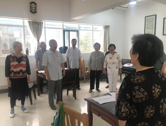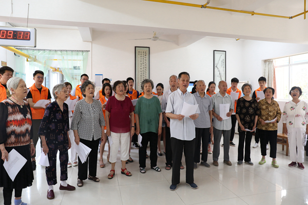 志愿者們與老人共唱《歌唱祖國》、《沒有共產(chǎn)黨就沒有新中國》、《社會主義好》等經(jīng)典紅歌