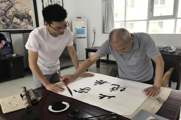 志愿者與老人切磋歌藝,老人一首,志愿者一首,其樂融融