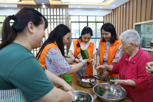 志愿者與老人一起包粽子,向老人請教包粽子方法,中華傳統(tǒng)文化得到傳承