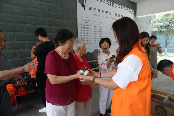志愿者將包好的粽子以及準備好的皮蛋、咸蛋送到福利院老人手中