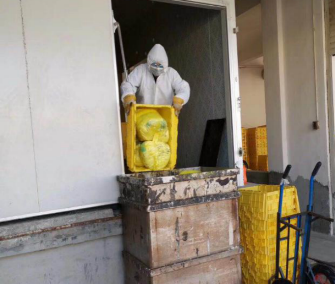 李奎在搬運(yùn)醫(yī)療廢物周轉(zhuǎn)箱