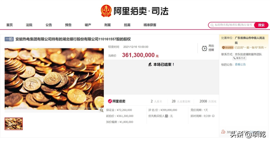近日,安能熱電集團(tuán)有限公司持有的湖北銀行1.10億股股權(quán)全部被拍賣,荊門城控集團(tuán)以3.61億元起拍價(jià)競得該筆股權(quán)。