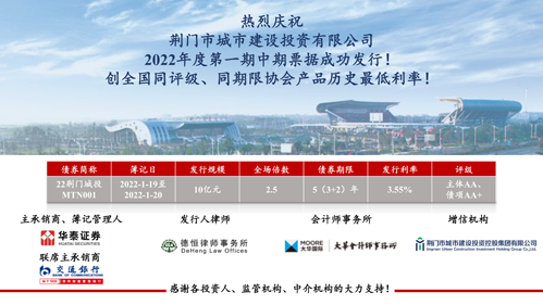 1月20日,市城控集團直屬子公司市城投公司成功發(fā)行了2022年度第一期中期票據(jù)10億元,票面利率3.55%,期限5(3+2)年,全場認購倍數(shù)2.5倍,創(chuàng)全國同評級、同期限協(xié)會產(chǎn)品歷史最低利率,保障了春節(jié)下場資金及一季度還本付息資金。
