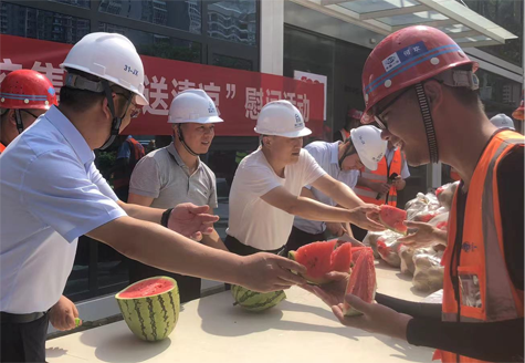 在慰問現(xiàn)場,張杰為參建人員送上香梨、西瓜、藿香正氣水等防暑慰問物資,并與在場人員親切交談,并代表市城控集團(tuán)黨委感謝大家不畏酷暑,堅(jiān)守在一線崗位,默默付出,叮囑大家在工作時(shí)務(wù)必注意身體健康和勞動(dòng)安全。同時(shí),他囑咐鑫建公司負(fù)責(zé)人進(jìn)一步加強(qiáng)夏季人員的勞動(dòng)保護(hù)和防暑降溫工作,按照“抓兩頭、歇中間”的原則調(diào)整好作業(yè)時(shí)間,控制室外作業(yè)時(shí)間和勞動(dòng)強(qiáng)度,普及好防暑降溫和中暑急救知識(shí),確保勞動(dòng)者的生產(chǎn)生活安全及身體健康。
